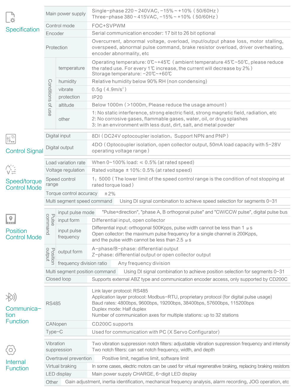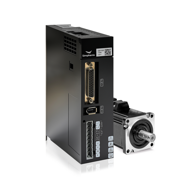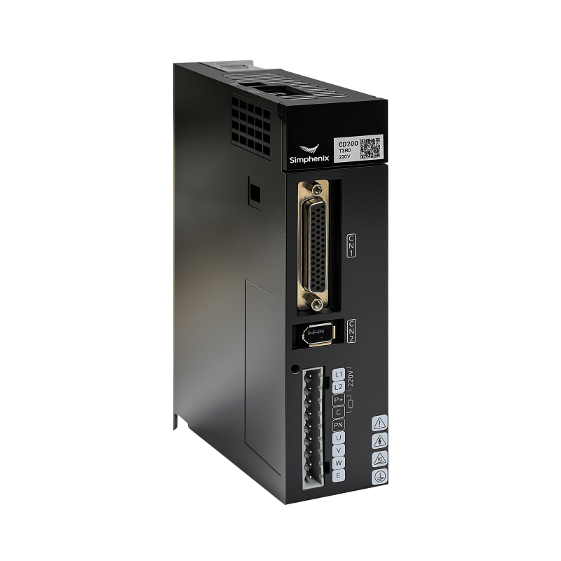 CD200 series Digital Pulse Servo Drive is a general-purpose high-performance AC servo driver developed by Simphoenix. It supports Modbus and CANopen communication protocols, by utilizing the corresponding communication interface and coordinating with the host controller, multi-axis servo networking operation can be achieved.The CD200 supports adaptive stiffness level setting, 1 second inertia auto-tuning, online load measurement, and vibration suppression for easy use. Combined with CM10 series high response servo motors, it runs reliably and smoothly, The drive aims to achieve quick and accurate position control, speed control, and torque control through high performance solutions for automation equipment in such industries as packaging, food production, CNC cutting, textiles, machine tools, woodworking carving, etc.